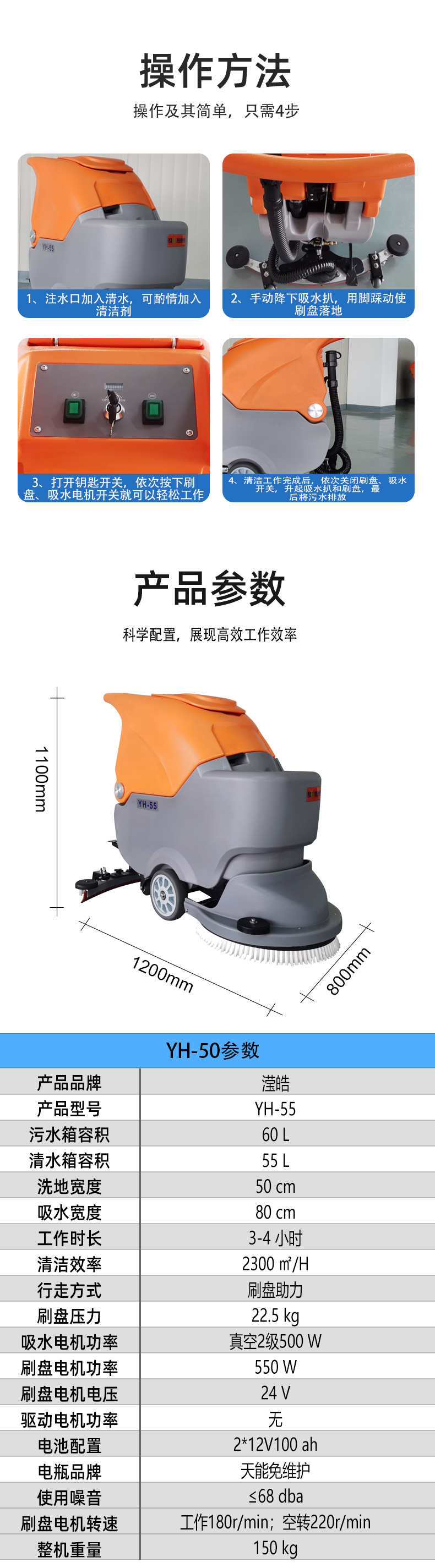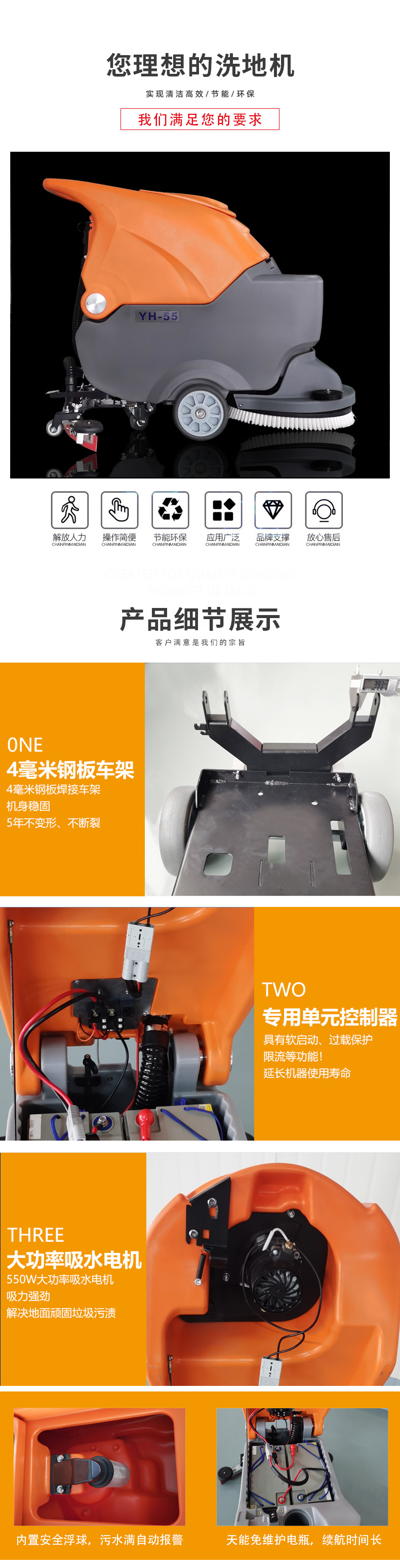 簡介:YH-55采用2塊100AH品牌超威或安能免維護(hù)電瓶,集灑水、刷地、去污、吸干為一體全自動(dòng)設(shè)備